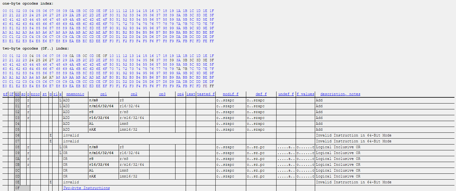 用于指定要执行的操作。操作码的长度大部分为1个字节,也有2或3个字节的。在Intel手册的附录中提供了可供查询的操作码表,但是查起来还是很繁琐,有一些在线文档可以提供操作码到指令和指令到操作码的快速双向查询101113。