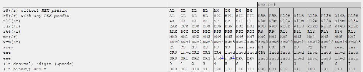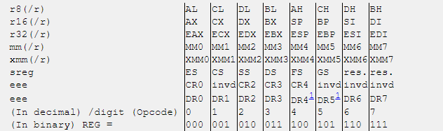 在下表中,寄存器编号在最上面,由Reg/Opcode字段确定;下面的四大块中,由ModR/M 字段合在一起可以确定。