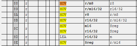 以 MOV 相关指令为例,假设现在有机器码 8901H。那么opcode为 89H, 由下表可知,这是 MOV r/m16/32 r16/32,其中r表示寄存器,m表示内存。